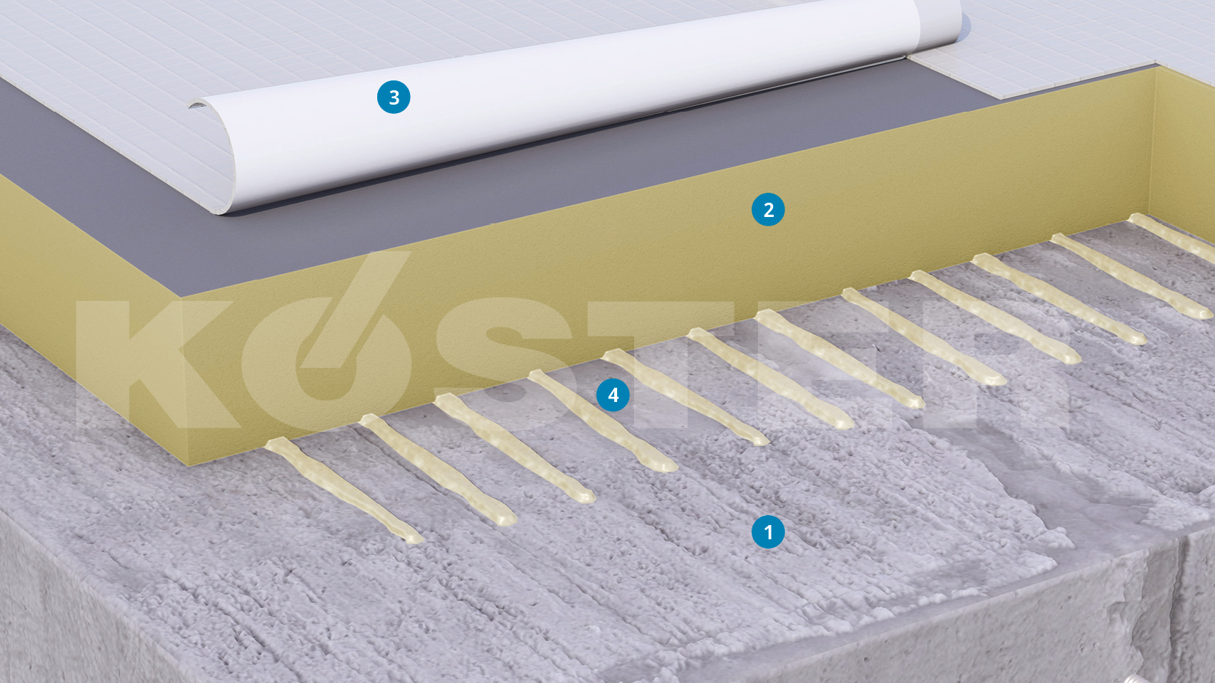 The self-adhering layer guarantees immediate, long-term adhesion and provides maximum protection against wind suction forces. The safe and easy welding of the overlaps with a hot air gun complete the installation advantages of the KÖSTER TPO SK (FR) single layer roofing system. Hardly any other material is as well suited for the waterproofing of roofs as thermoplastic polyolefin (TPO).