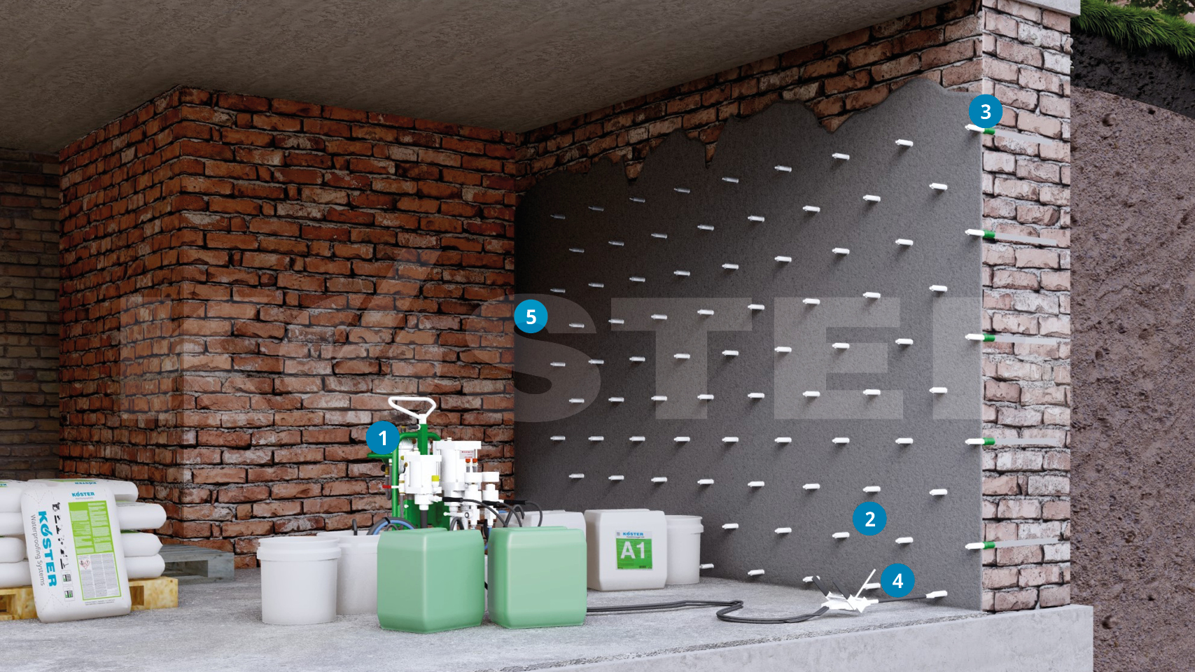 KÖSTER Injection Gel G4 is injected in multiple phases until a pressure resistance is achieved. Afterwards the packer holes are filled with KÖSTER KB-Fix 5. For a decorative and functional surface design, KÖSTER Restoration Plasters can be applied over the KÖSTER Injection Barrier.