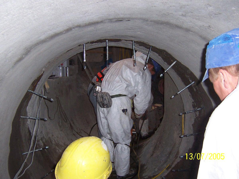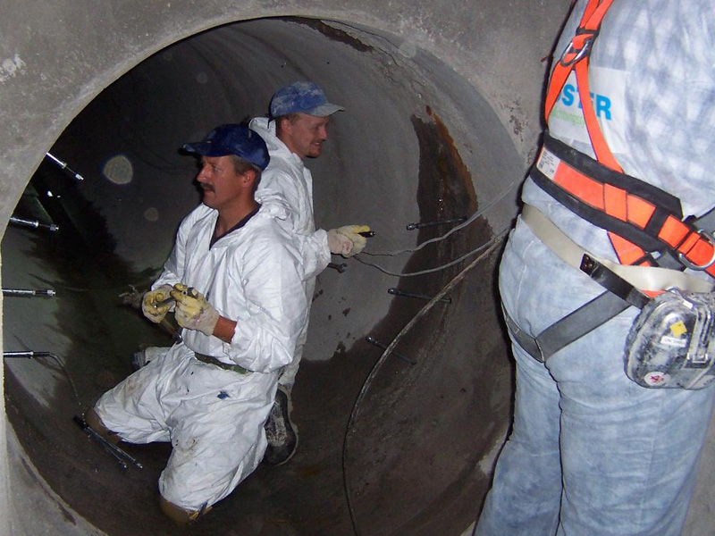 Abdichtung von Fugen an Betonringen aus Fertigteilelementen, Durchmesser 160cm; Der Anschluss eines Abwasserschachtes, ca. 16 m unter OK Gelände, hatte sich im Anschlussbereich an den Sammelschacht gelöst. Aufgrund fehlender Dichtungen zeigte sich hier ein Abriss zwischen Betonfertigteil und Betonwand des Schachtes. Außerdem mussten im Verlauf des Schachtes noch diverse Stellen in Bereichen der Anschlussfugen umlaufend injiziert werden.
