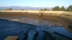 Emergency repair of sections of the facing of compensating basin. Sealing and restoration of the joints between the different sections of the construction with KÖSTER PUR Gel, KÖSTER SB-Bonding Emulsion, and KÖSTER Repair Mortar. Sealing and restoration of the cracks in the vertical walls with KÖSTER 2 IN 1 and KÖSTER KB-Fix 5.