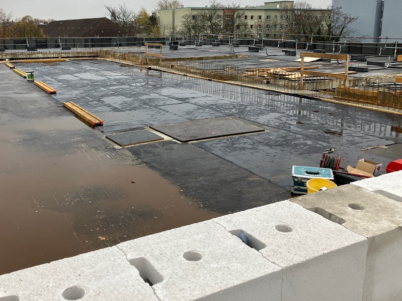 Die neu betonierte Zwischendecke im 1. Obergeschoss wurde mit KÖSTER KSK Voranstrich BL grundiert und nach der Ablüftezeit mit KÖSTER KSK SY 15 abgedichtet. Rohrdurchführungen durch die Decke wurden mit KÖSTER MS-Flexfolie an die KÖSTER KSK Bahnen angeschlossen. Der Randbereich wurde mit KÖSTER Fixband 15 SY an der senkrechten Wand angeschlossen.