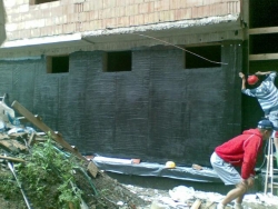 Pamatu ārēja hidroizolācija ar palīmējošo gumijas/ bitumena membrānu
