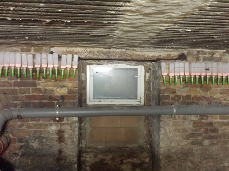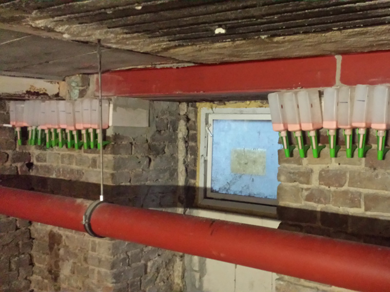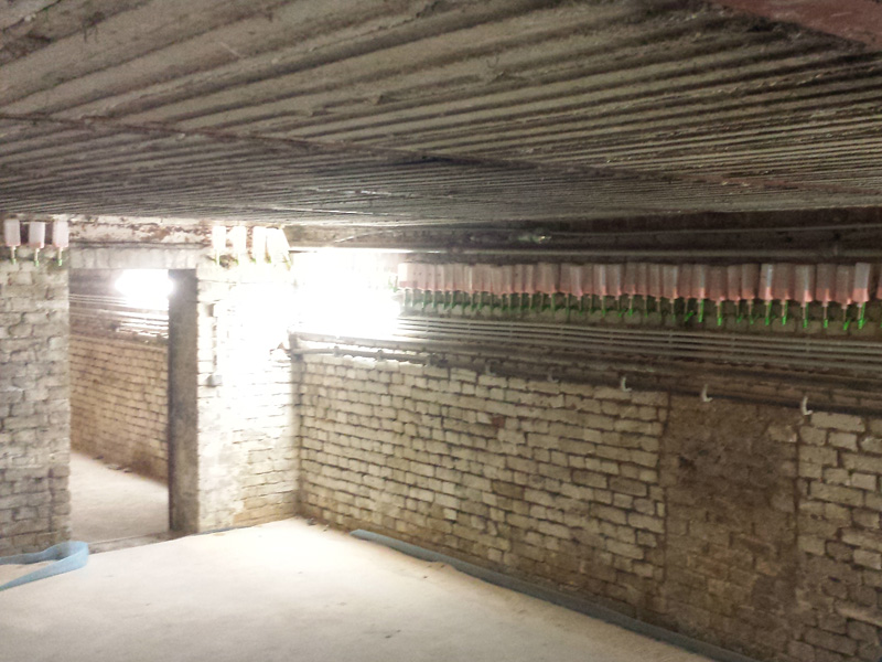 Installation von ca. 375 m druckloser Horizontalsperre im Saugwinkelverfahren bei einer Mauerwerksstärke von 60 cm.